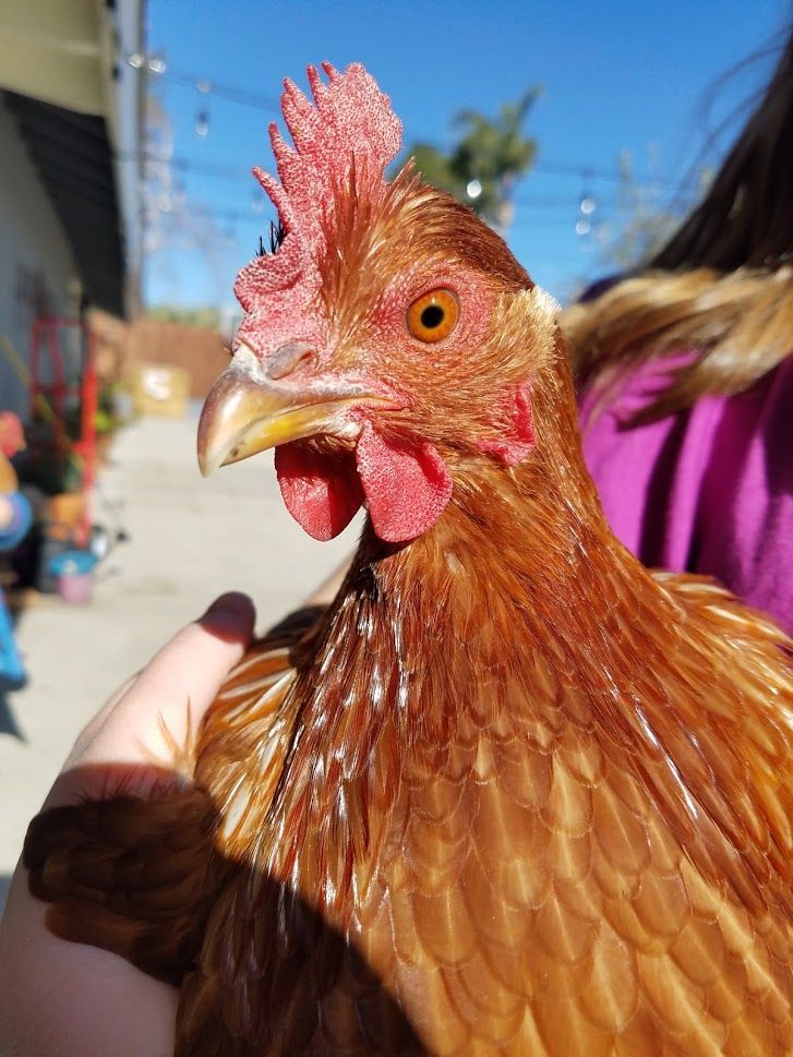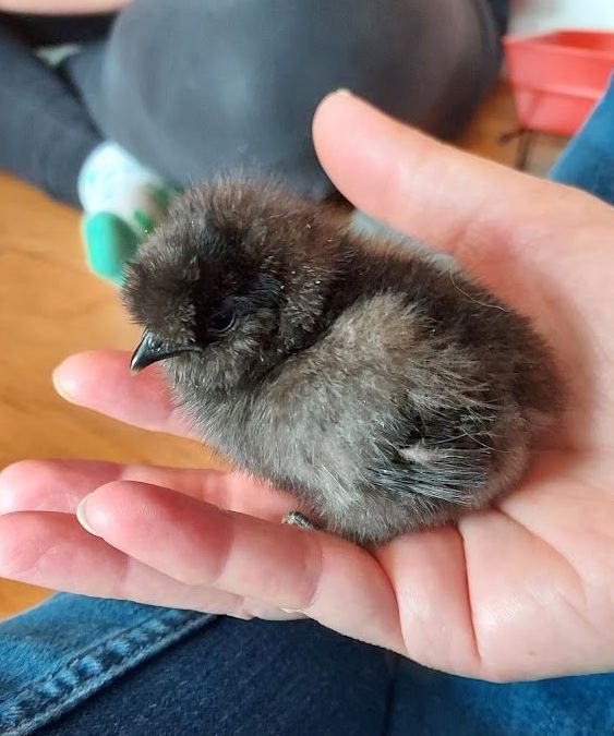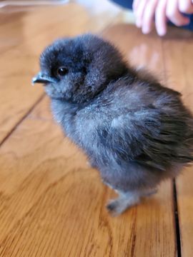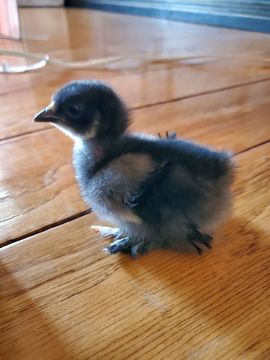 T-Rex is a Black and Yellow Frizzle. She is about 1 month old and likes to sleep, eat, poop and chirp. In 6 months T-Rex will produce 2-3 eggs per week whose shell will be cream color.